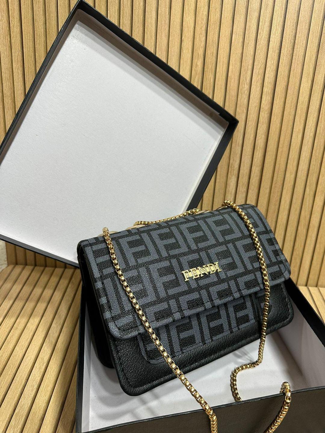 Women’s Printed Leather Crossbody Bag with Chain – Brown & Black